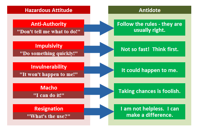 The federal aviation administration's (faa) literature defines five hazardous attitudes that can undermine a pilot's aeronautical decision making. Hazardous attitudes are detrimental to flight safety. During my general aviation training, i came across a list that has been a brilliant guide to help keep my flying decisions in check. I'm air (like i'm err or i'm erring).